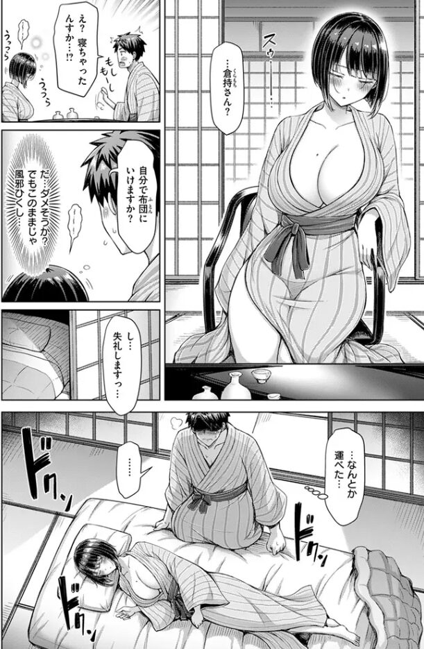 夜、部屋で飲んでいたら酔って浴衣がはだけてしまい、倉持さんの胸がポロリ・・・